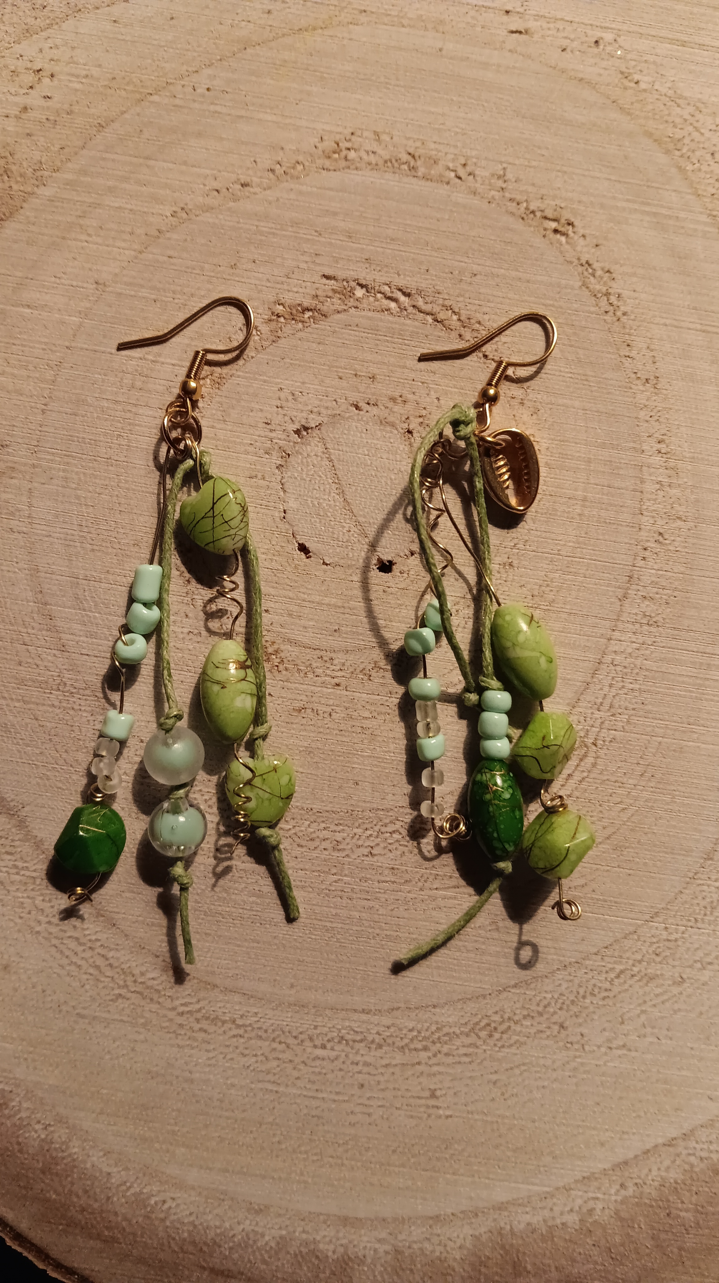 Ces boucles d’oreilles artisanales mêlent cordons verts et perles assorties dans des tons vert clair et émeraude, aux textures variées dont un bel effet craquelé. Un coquillage cowry doré apporte une touche bohème et estivale supplémentaire. Légères et pleines de caractère, elles ajoutent un style naturel et délicatement raffiné à votre tenue.