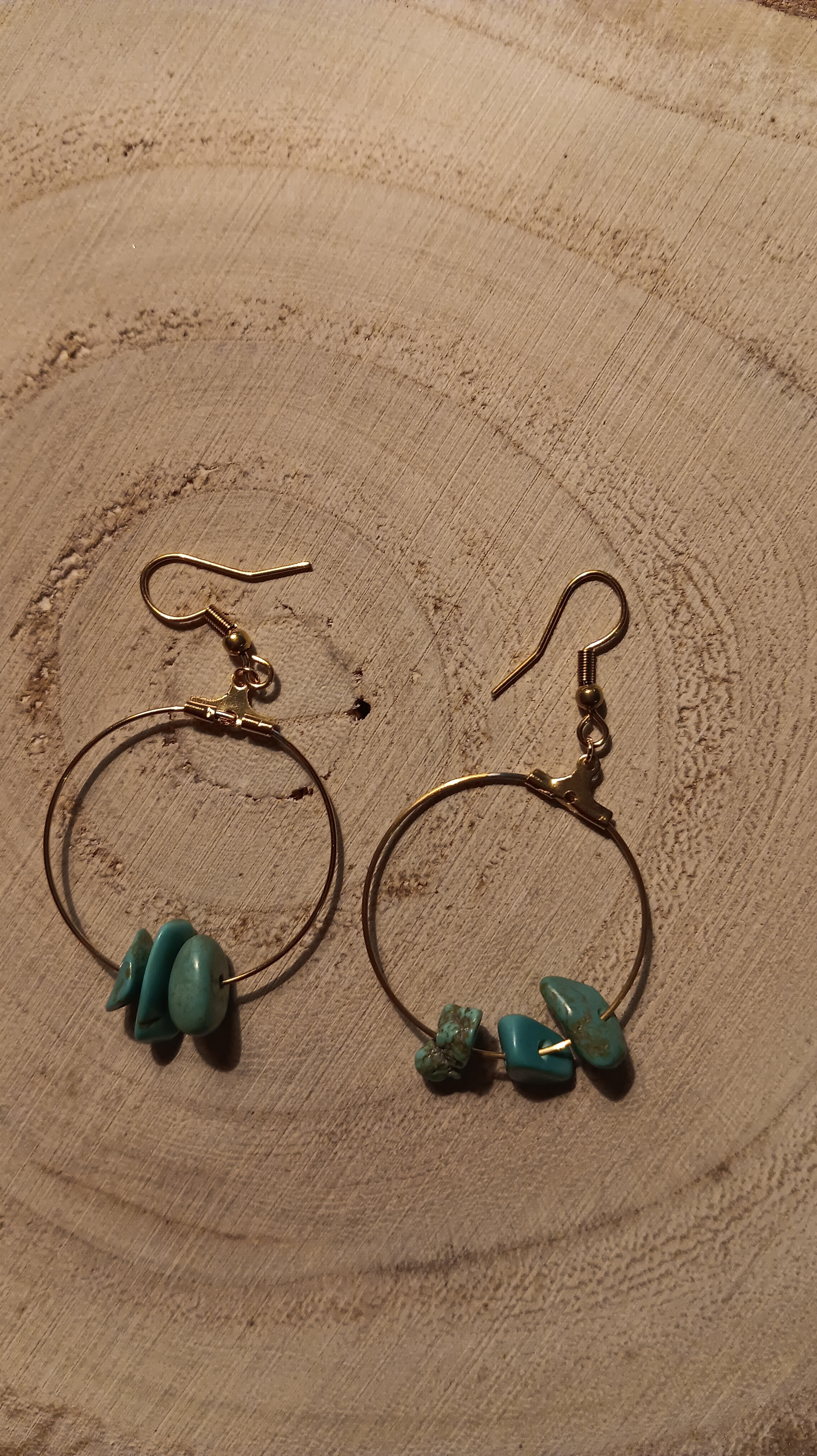Ces créoles dorées fines sont ornées de véritables pierres semi-précieuses turquoise, chacune sélectionnée pour sa couleur unique et ses éclats naturels. Leur design épuré met en valeur la beauté brute des pierres, offrant un accessoire à la fois délicat, intemporel et authentique.